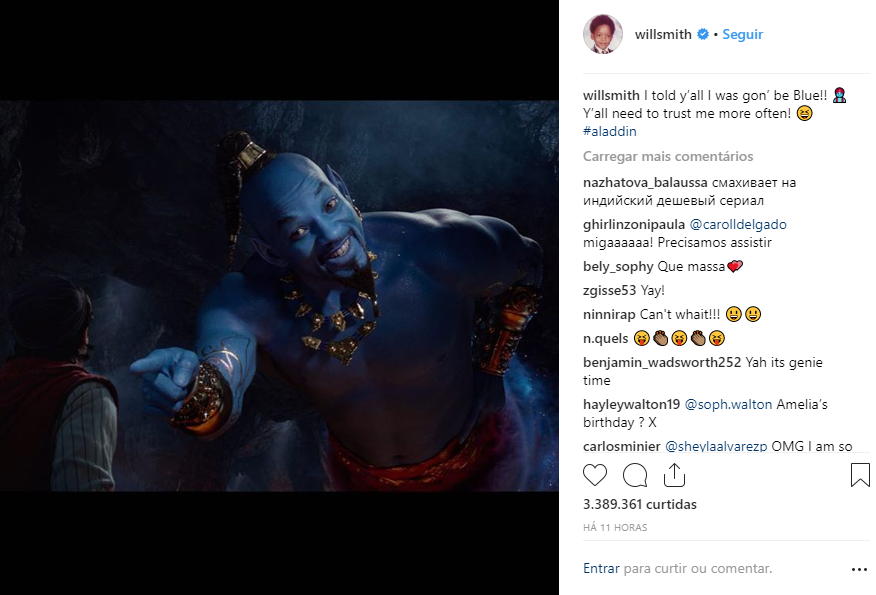 Will Smith aparece nos trending topics após divulgar trailer do filme Aladdin no intervalo da premiação Grammy, ele levou os fãs à loucura também com a postagem no Instagram, ele faz o papel de gênio da lâmpada e brinca com os fãs que criticaram por aparecer primeiramente sem a cor azul, ele diz: